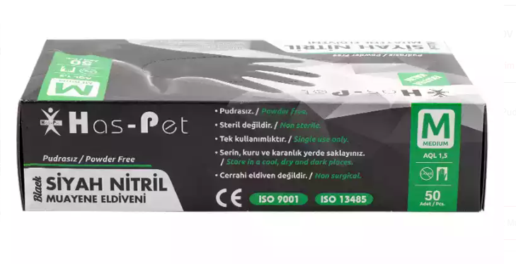 Has-Pet Siyah Nitril Eldiven – Small (S) Beden | Pudrasız, Tek Kullanımlık
