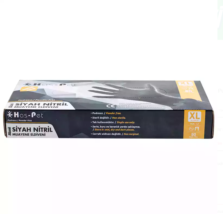 Has-Pet Siyah Nitril Eldiven – Small (S) Beden | Pudrasız, Tek Kullanımlık