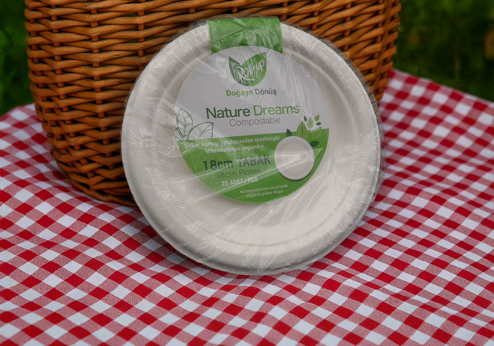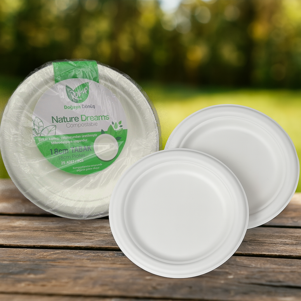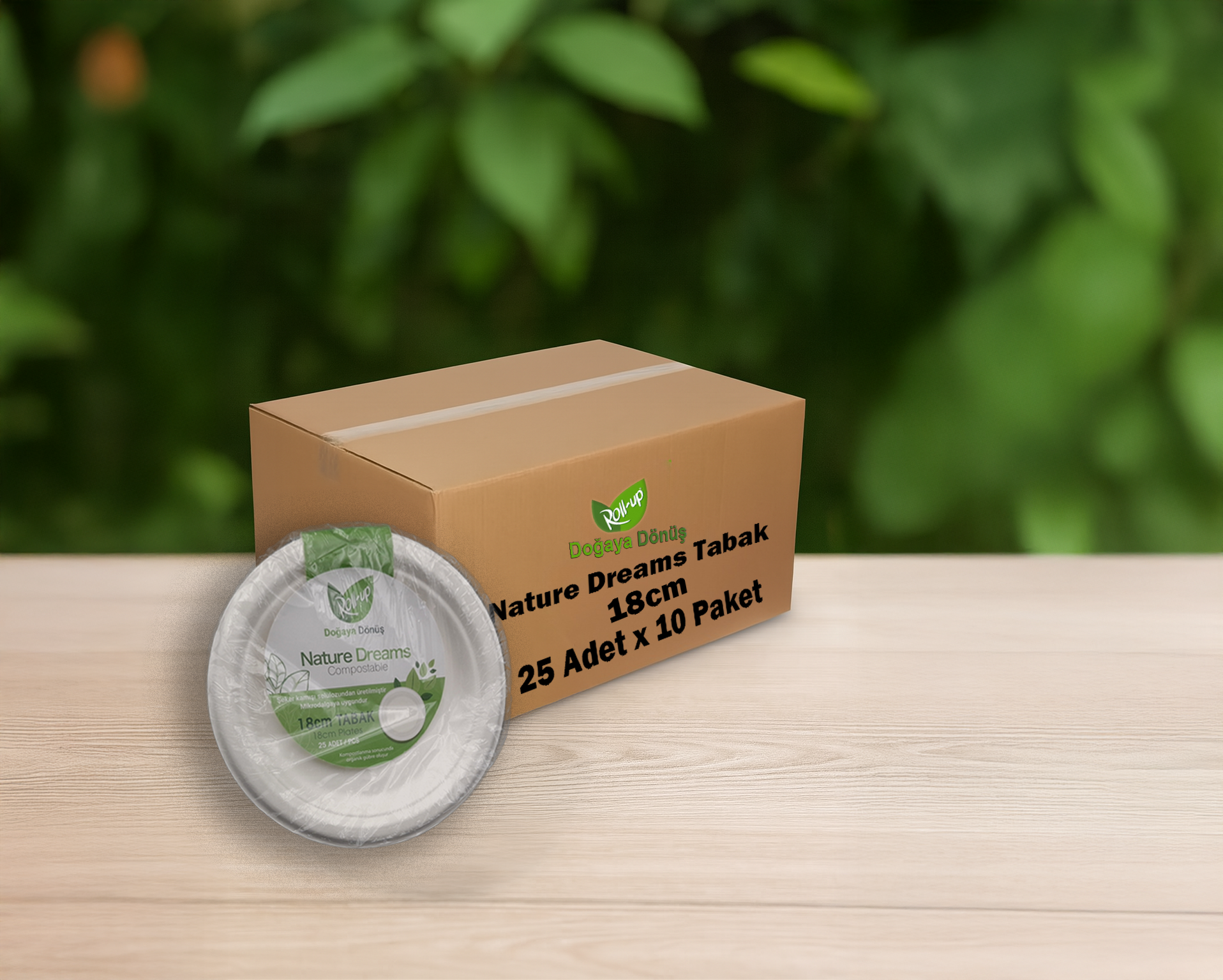 Roll-Up Nature Dreams Serisi 18 cm Doğa Dostu Tabak, çevre dostu ve sürdürülebilir tüketim için geliştirilmiş bir üründür. Üretimi sırasında hiçbir ağaç kesilmemiş, tamamen bitkisel selülozdan üretilmiştir ve %100 doğada çözünebilen yapıdadır.