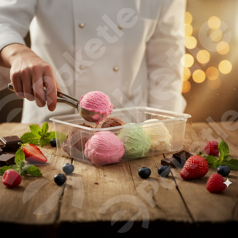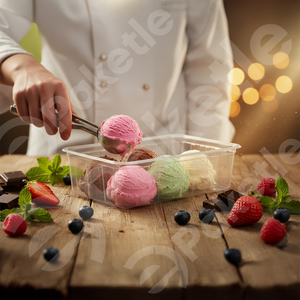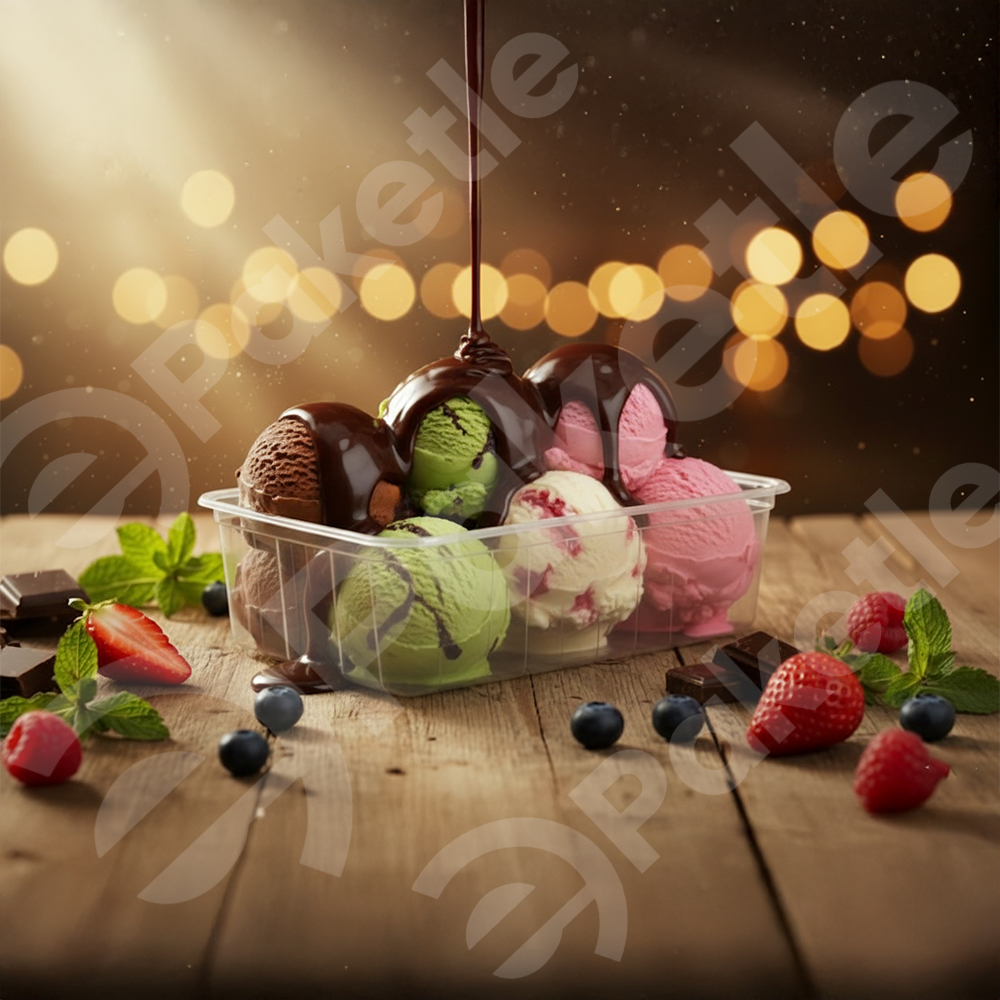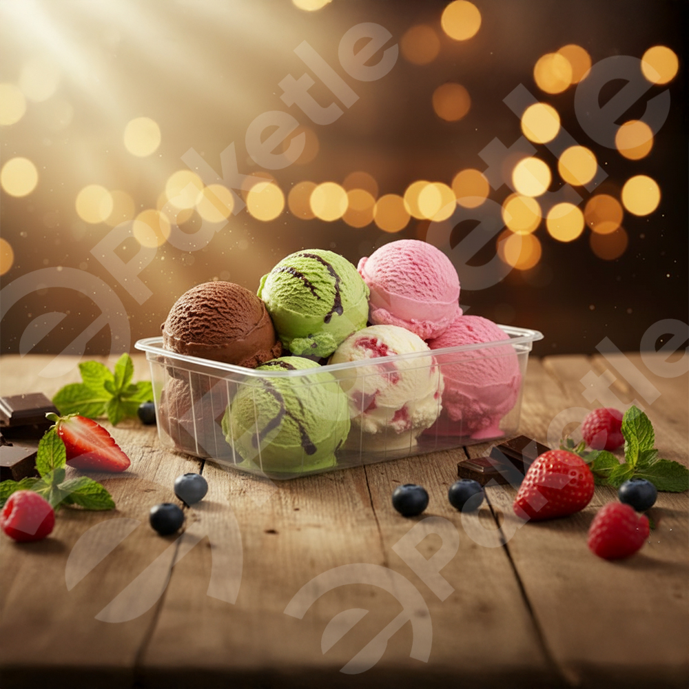 1000 gr şeffaf plastik dondurma kasesi, büyük porsiyon tatlı ve dondurma sunumları için idealdir. Şeffaf yapısı sayesinde içindeki ürünler şık bir şekilde sunulur. Dayanıklı plastikten üretilmiş olup tek kullanımlıktır. 100’lü paketler halinde ve 1000 adetlik kolilerle satışa sunulmaktadır. Pastaneler, cafeler, restoranlar ve dondurmacılar için pratik ve hijyenik bir çözümdür.