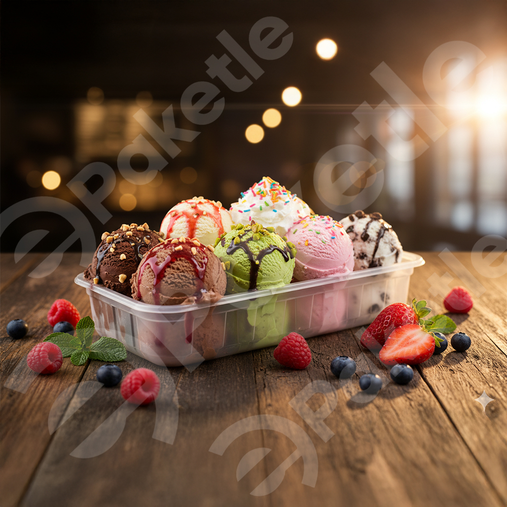 500 gr şeffaf plastik dondurma kasesi, büyük porsiyon tatlı ve dondurma sunumları için idealdir. Şeffaf yapısı sayesinde içindeki ürünün sunumunu ön plana çıkarır. Dayanıklı ve kaliteli plastikten üretilmiş olup tek kullanımlıktır. 100’lü paketler halinde ve 1200 adetlik kolilerde satışa sunulmaktadır. Pastaneler, cafeler, restoranlar ve dondurmacılar için hijyenik ve pratik bir çözümdür.