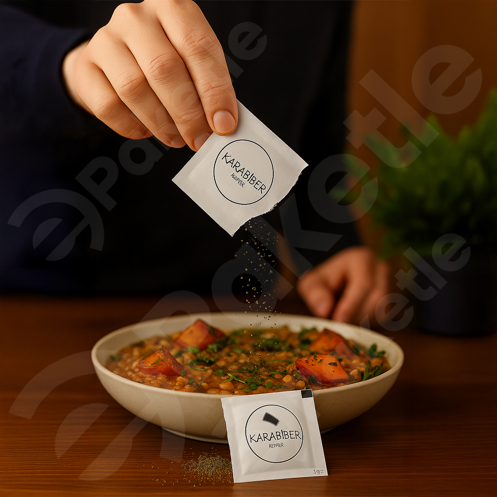 Stick Karabiber, 5×5 cm ölçülerinde kare formda, kağıt ambalajlı ve ortalama 0,5 gr karabiber içeren tek kullanımlık baharat paketidir. Restoran, kafe ve paket servislerde yemeklerin yanında pratik kullanım sağlar. Ayrıca fabrika yemekhaneleri ve catering mutfaklarında hijyenik ve ekonomik baharat çözümü sunar. 1000’li koli halinde toplu kullanıma uygundur.