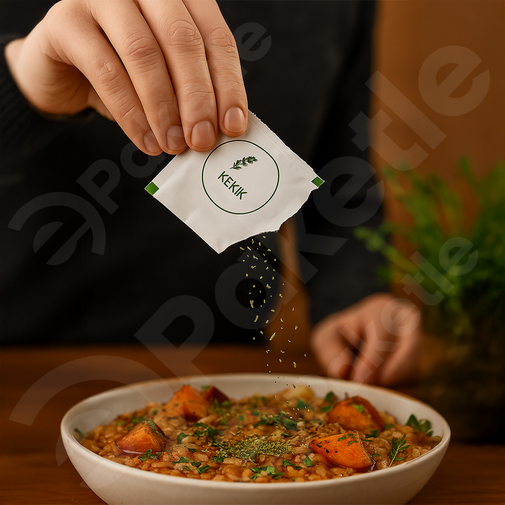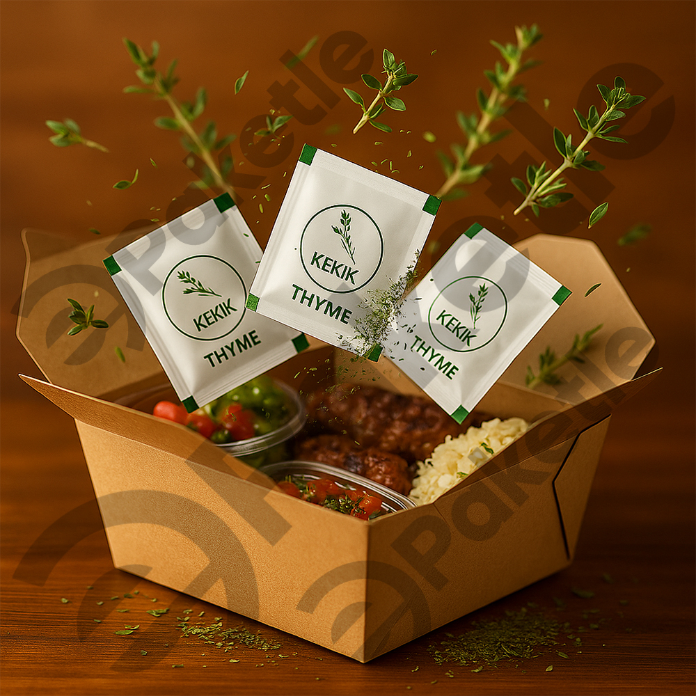 Stick Kekik, 5×5 cm ölçülerinde kare formda, kağıt ambalajlı ve ortalama 1 gr kekik içeren tek kullanımlık baharat paketidir. Restoran, kafe ve paket servislerde yemeklerin yanında pratik kullanım sağlar. Ayrıca fabrika yemekhaneleri ve catering mutfaklarında hijyenik ve ekonomik baharat çözümü sunar. 1000’li koli halinde toplu kullanıma uygundur.